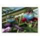 A 3D computer-generated closeup created in Vue, focusing on raindrops dripping off a blade of grass in a field of flowers. The blurred red, yellow, and lavender primroses in the background are reflected clearly in the water drops.