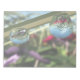 A 3D computer-generated closeup created in Vue, focusing on raindrops dripping off a blade of grass in a field of flowers. The blurred red, yellow, and lavender primroses in the background are reflected clearly in the water drops.