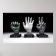 3 statuettes showing the hand-game Roshambo, made out of the hand gestures corresponding to the materials of rock, paper and scissors