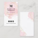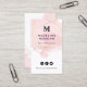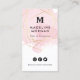 Pretty monogrammed business card with your initial in black against a splash of rosy pink watercolor inside faint geometric lines of faux gold. Add your social media handle beneath modern black and white icons.
