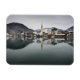 Rectangular photo magnet with a winter scene with the reflection of the yellow church tower in the still water of Tegernsee lake and with snow on the roofs of the houses of the town Rottach-Egern with the Alps mountains in the background in Bavaria (Bayern), Germany.