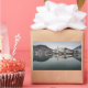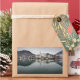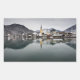 Rectangular photo sticker of a winter scene with the reflection of the yellow church tower in the still water of Tegernsee lake and with snow on the roofs of the houses of the town Rottach-Egern with the Alps mountains in the background in Bavaria (Bayern), Germany.