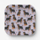 Cute Rottweiler dogs sit and stand with black and tan coats with scattered dog bones and pawprints pattern.