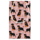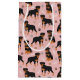 Cute Rottweiler dogs sit and stand with black and tan coats with scattered dog bones and pawprints pattern.