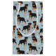Cute Rottweiler dogs sit and stand with black and tan coats with scattered dog bones and pawprints pattern.
