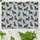 Cute Rottweiler dogs sit and stand with black and tan coats with scattered dog bones and pawprints pattern.