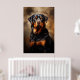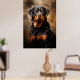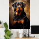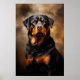 A majestic Rottweiler dog depicted with a gaze that conveys intelligence and a touch of solemnity. Set against a blurred background that ranges from light to dark hues, the dog's gleaming eyes and glossy black and tan coat stand out prominently.