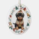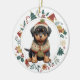 This cute Holiday ornament features a watercolor image of an adorable Rottweiler puppy dressed in his winter ski sweater and hat. The image is framed within a colourful circle wreath made up of various Holiday images, including a snowman, bells, candy cane, stocking, holly, and more! The back of the ornament has the same wreath image with your custom text in green, gold, and red.