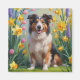 A cheerful dog sits peacefully on lush green grass, surrounded by colourful spring blooms under a soft blue sky. This digital oil painting captures a serene moment with expressive brushstrokes, warm colours, and a sense of gentle joy.
