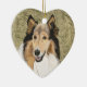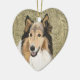This ceramic heart features my portrait of a lovely elegant tan and white Long Haired Collie Sheepdog against a brown floral background. Rough Collies were used to herd sheep in scotland, and make popular pets. This beautiful hanging ornament would make a great gift for a Collie lover.