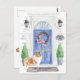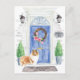 Announce your new address with our stylish announcement featuring a Rough Collie, blue front door, welcome mat, slate sign, topiaries and a floral wreath set on a grey brick background.
