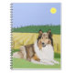 This notebook features my colourful drawing of a gorgeous long haired, Rough Collie, with fields behind.
