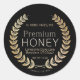 The words "HONEY" and "Premium" are printed in an embossed gold text font. Laurel leaf border with gold gradient. Round Label with black background shows off the gold text. "Product of USA" (or State Name) in small curved text along bottom edge of label. Happy Beekeeping!