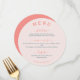 A simple, round wedding menu with a pink and blue palette. The background is blush pink, the title, the section headers and bride and groom names are hot pink and the rest of the text is blue. The title Menu and the names are arched text in all caps, the section headers are written in a modern script.
