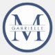 A modern preppy navy blue and white round monogram initial sticker and favour label, a simple design to coordinate with all types of events or personalised stationery.