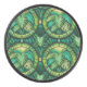 Round coaster featuring a vibrant floral pattern with green leaves and circular motifs. The side view shows a textured black edge, adding contrast.