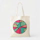 A black outlined circle divided by black lines into different colour areas creating a stylish original circular hard edge abstract motif.
