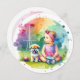 Disc golf themed girl's baby shower invitation with a pretty watercolor themed disc golf course, a baby girl and a dog in pink, orange, blue and green.