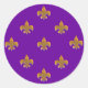 Round stickers in your choice of two sizes, with a pretty fleur de lis pattern design.  The fleurs are gold, and we added a purple background, which you can customise to any colour you like.  The fleur-de-lis is a stylised lily (in French, fleur means flower, and lis means lily) or iris used as a decorative design or symbol.  It's a symbol of all things France, and Quebec,  and New Orleans and many other places.