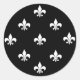Round stickers in your choice of two sizes, with a large fleur de lis design. This one is white, and we added a black background but you can easily change that to any colour you like. The fleur-de-lis is a stylised lily (in French, fleur means flower, and lis means lily) or iris used as a decorative design or symbol. It's a symbol of all things France, and Quebec, and New Orleans and many other places.