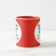 Round RED double image frame custom Combo Mug for photo or logo, 11 oz., 3.2" diameter x 3.8" high, with RED background double image frame (two individually customizable design areas) providing maximum coverage of the mug in RED. See store for more templated font options. The background color has been chosen to closely resemble the combo mug inside and handle color but may not match exactly, due to the difference between printing and enamel tones.
