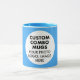 Round LIGHT BLUE siongle image frame custom Combo Mug for photo or logo, 11 oz., 3.2" diameter x 3.8" high, with LIGHT BLUE background single image frame (one central customisable design area) providing maximum coverage of the mug in LIGHT BLUE. See store for more templated font options. The background colour has been chosen to closely resemble the combo mug inside and handle colour but may not match exactly, due to the difference between printing and enamel tones.