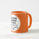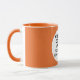 Round ORANGE siongle image frame custom Combo Mug for photo or logo, 11 oz., 3.2" diameter x 3.8" high, with ORANGE background single image frame (one central customizable design area) providing maximum coverage of the mug in ORANGE. See store for more templated font options. The background color has been chosen to closely resemble the combo mug inside and handle color but may not match exactly, due to the difference between printing and enamel tones.