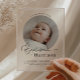 A modern, minimal Baptism Invitation featuring a round photo and the word 'Baptism' in a calligraphy style font. Please note that you cannot change the 'Baptism' word but you can edit all of the other text in this design. You can change the colour or you can delete it and replace it with a new text box if you prefer.