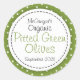 Green and white food label perfect for labelling green olives, chutney, oil or other green hued fruits turned into jams, preserves, jelly's or other green or olive based food. Perfect for Christmas gifts, cookie exchange parties or for selling your home grown products at farmer's market's and craft fairs. Use these stickers to seal your Christmas gifts or for a professional look to your for sale goodies. Also perfect for children's homecooked favours and gifts to family and friends. Currently reads McGregor's Organic Pitted Green Olives plus add the date you item was produced. Fully customisable with your own name and product details and date. Designed by Sarah Trett.