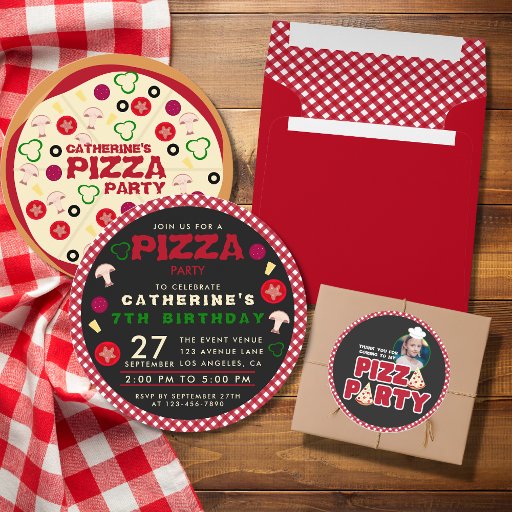 Celebrate your kid's birthday in delicious fun style with a pizza-themed party! This pizza themed birthday invitation design features a colourful illustration of a pizza with toppings that create a festive and inviting atmosphere. The background has been designed to resemble a chequered red and white tablecloth, which is often associated with pizza restaurants. Additionally, playful and funny sauce red custom text make the invitation more fun and inviting. Overall, this pizza themed birthday invitation design is a unique and creative way to get guests excited about the upcoming celebration.