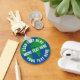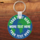 Round planet earth button keychains with custom text. Blue and green globe logo with white text template. Create key chains for global warming, climate change environmental issues, nature preserve, green energy, forrest protection, protests, plastic soup, recycle, recycling etc. Land sea drawing. Save the planet, save the earth!