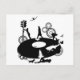 A black white image of a record turntable with silhouettes of people on and around it, a stop light, a cat, a dog, a plane in the sky and various circle shapes. The background colour can be changed.