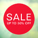 Sale sign window cling featuring two rows of customisable text on a red cisrcle background. Default text is "Sale" and "up to 50% off". Put on your shop window to announce current sales.