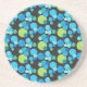 A round sandstone coaster or drinks mat, with a 'Blue Moons' abstract pattern in bright blues and neon green on a black background; from a handpainted paper collage design by Judy Adamson.
