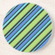 An eye-catching, round Sandstone Coaster, with a deckchair-striped pattern in Dazzling Blue, Neon Green, Turquoise and Black. part of the Posh & Painterly 'Blue Moons' collection, the design is from a hand-painted paper collage by Judy Adamson.