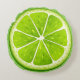 Round throw pillow shown in the colour of lime green with a luscious lime slice print.