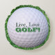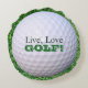 This round throw pillow has images of a white golfball on top of some green turf and has "Live, Love, GOLF!" on it in green lettering. It would make a fun addition to the man cave, den, or rec room and makes a great gift for the avid golfer.