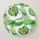 Round throw pillow is shown in white with a pretty tropical leaves design.