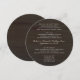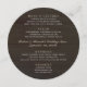 Round wedding menu with dark wood look. The title is in the centre with four sections for listing appetizers / hors d’oeuvres, salad, entrées, and dessert or whatever food items will be served at the reception or rehearsal dinner. Each section has space for up to four lines of text. Dark brown colour with tan headings and centre script which can hold the couple’s names, menu title and date of event. Menu items are in uppercase printed white text. Shown as the round shape, or choose square. Paper upgrades offered.