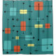 This atomic-age inspired mid century modern design has bold lines and geometric shapes in teal, turquoise, yellow and orange.