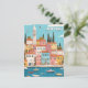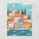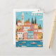 This travel postcard showcases a whimsical illustration representing Rovinj's cityscape. It is a great postcard for travelers to Rovinj, Croatia.