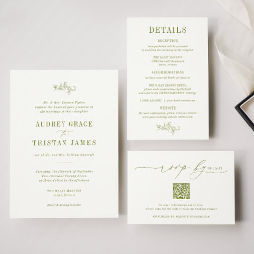 ROWAN, modern minimalist wedding invitation. Template features, trendy moss green typography with delicate botanical branch illustration.