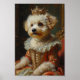 An elegant royal portrait featuring the charming Bichon Frise portrayed as a French queen. Inspired by classical European oil paintings, the design highlights the breed’s fluffy white coat and cheerful personality with luxurious royal attire and a jewelled crown.