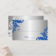 © 2018 Socialite Designs. Beautiful corner swirls and flourishes table card in royal blue and silver-grey, with a silver-look background. An elegant design for any time of year celebration. The design on the back was made available so that you can add additional information.