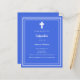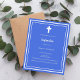A royal blue background, decorated with a white frame, and a white cross Personalise and add the name and details. White text.