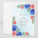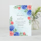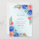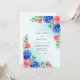 This design features a soft watercolor wash background in a light sky blue tone. Vibrant royal blue hydrangeas and coral pink roses create a lush floral border. Delicate green leaves and botanical accents provide a natural, airy feel perfect for a warm-weather event. The artwork evokes a romantic and artistic mood through its painterly textures and bright palette.
