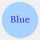 The word Blue is printed in blue on a light blue background, on stickers.