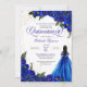 Quinceanera invitation in royal blue roses with gold accents and a girl with elegant ball gown. Check the shop for this invitation with girls in different hair colours and skin tones.