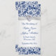 Royal blue floral swirls pattern decorated with printed images of silver white ribbon and jewel in the shape of heart Wedding Program Rack card.