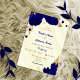 elegant luxury royal blue flowers with some gold leaves against marble background wedding invitation